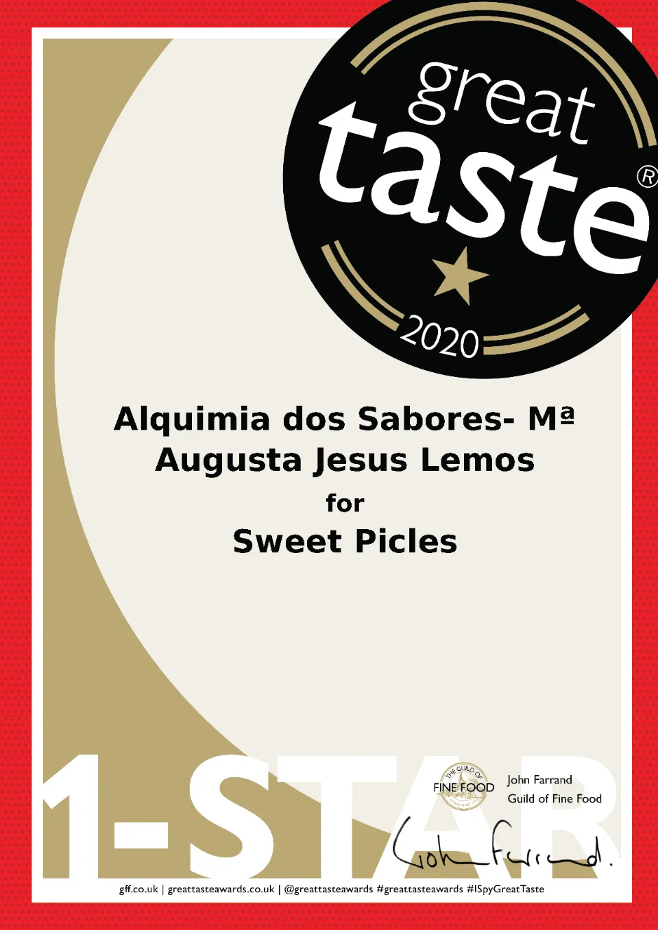 Medalha de ouro e melhor dos melhores na categoria de picles e similares, no concurso nacional de sal e condimentos tradicionais portugueses. Ver Certificado | Cert. Great Taste