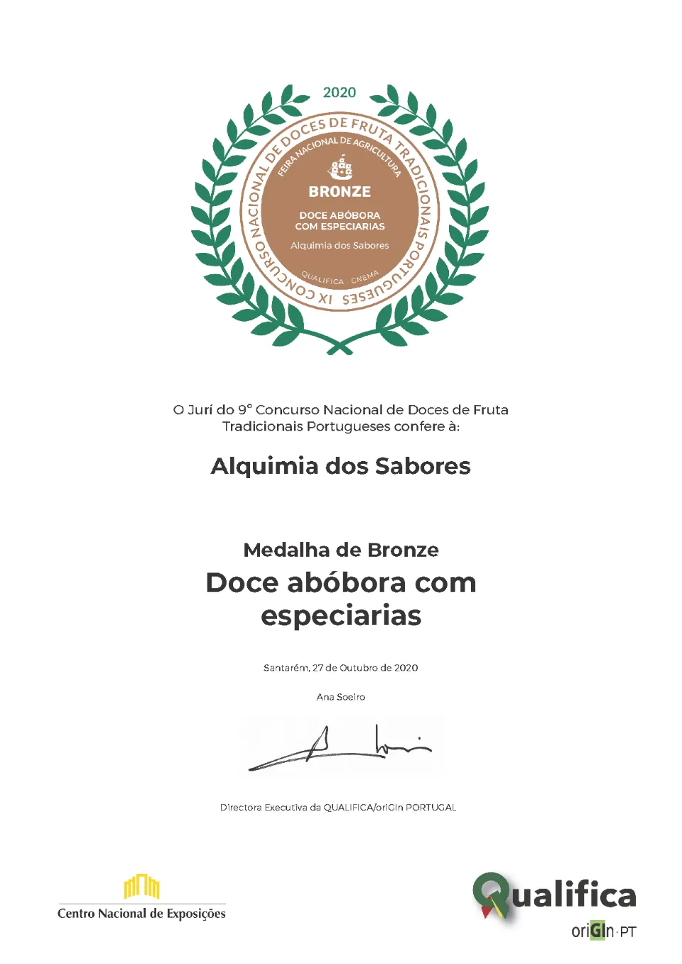 O júri do 9.º Concurso Nacional de Doces de Fruta Tradicionais Portugueses conferiu à Alquimia dos Sabores a Medalha de Bronze pelo seu Doce de Abóbora e Especiarias.