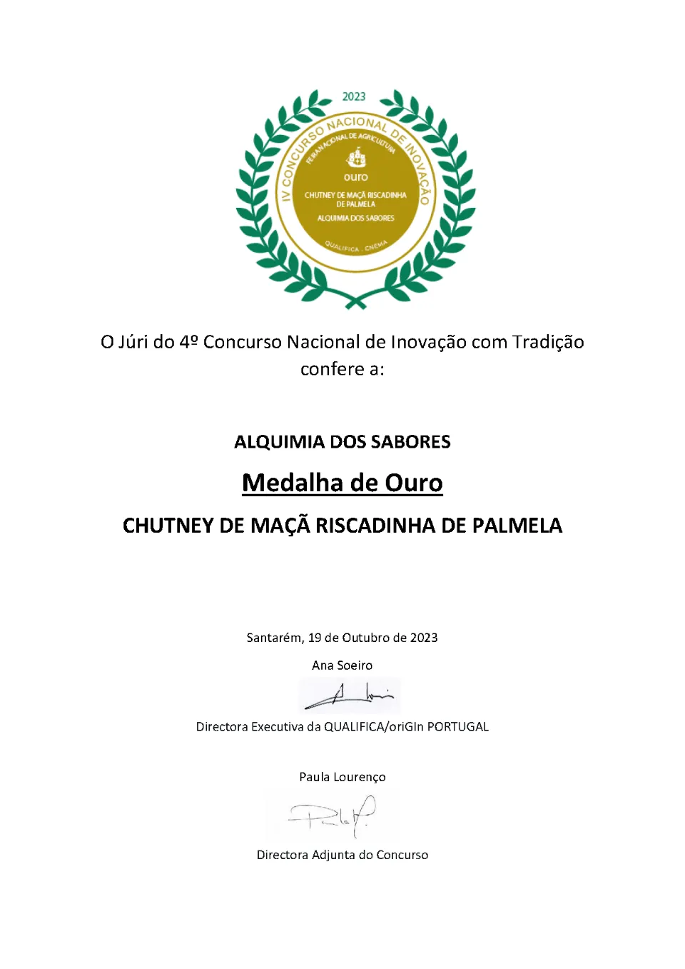 O júri do 4.º Concurso Nacional de Inovação com Tradição conferiu à Alquimia dos Sabores a Medalha de Ouro pelo Chutney de Maçã Riscadinha de Palmela.