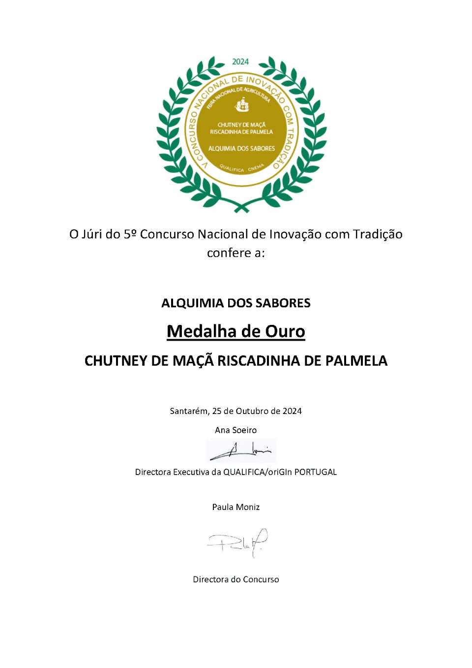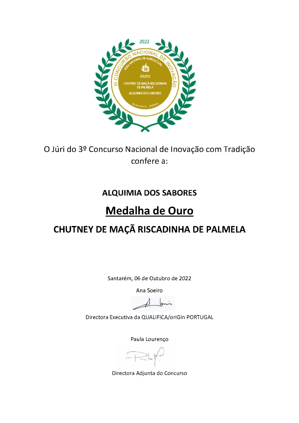 O júri do 5.º Concurso Nacional de Inovação com Tradição conferiu à Alquimia dos Sabores a Medalha de Ouro pelo Chutney de Maçã Riscadinha de Palmela.
