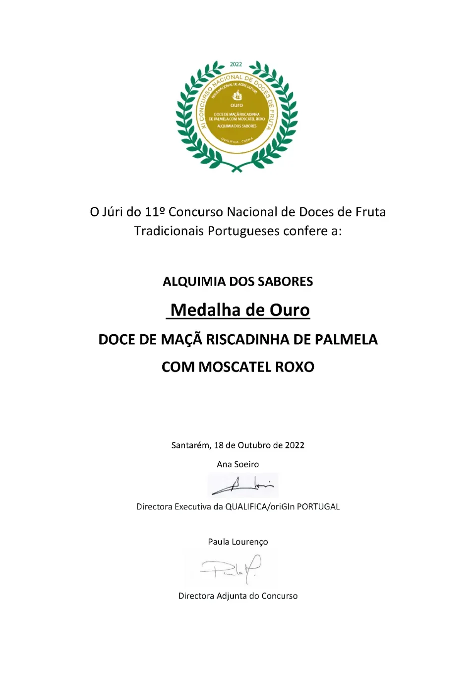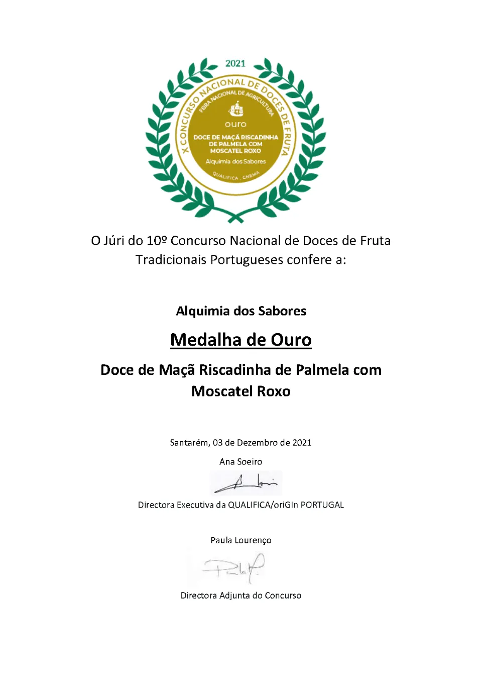 O júri do 10.º Concurso Nacional de Doces de Fruta Tradicionais Portugueses conferiu à Alquimia dos Sabores a Medalha de Ouro pelo Doce de Maçã Riscadinha de Palmela com Moscatel Roxo.