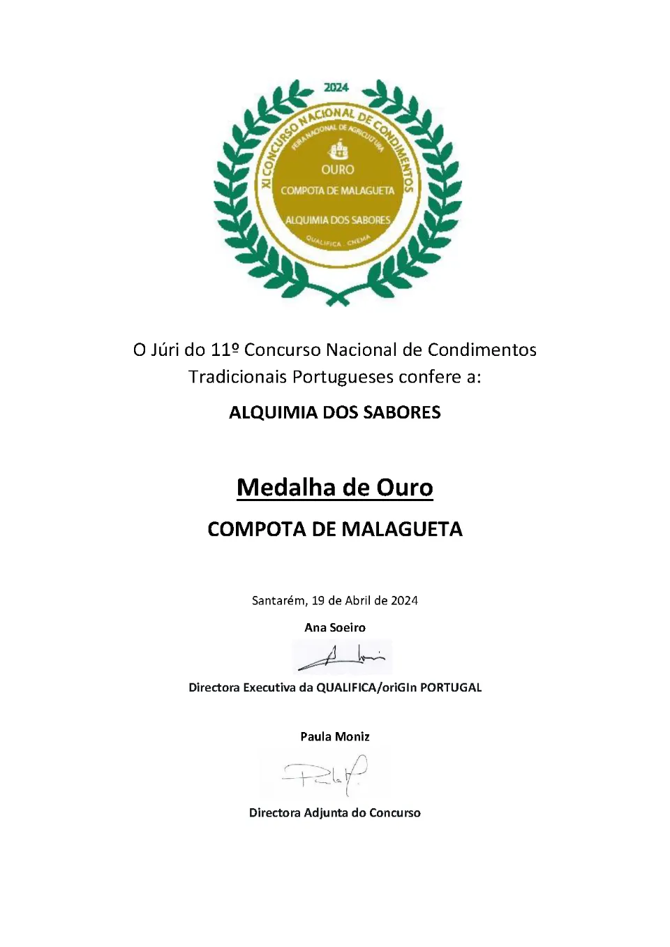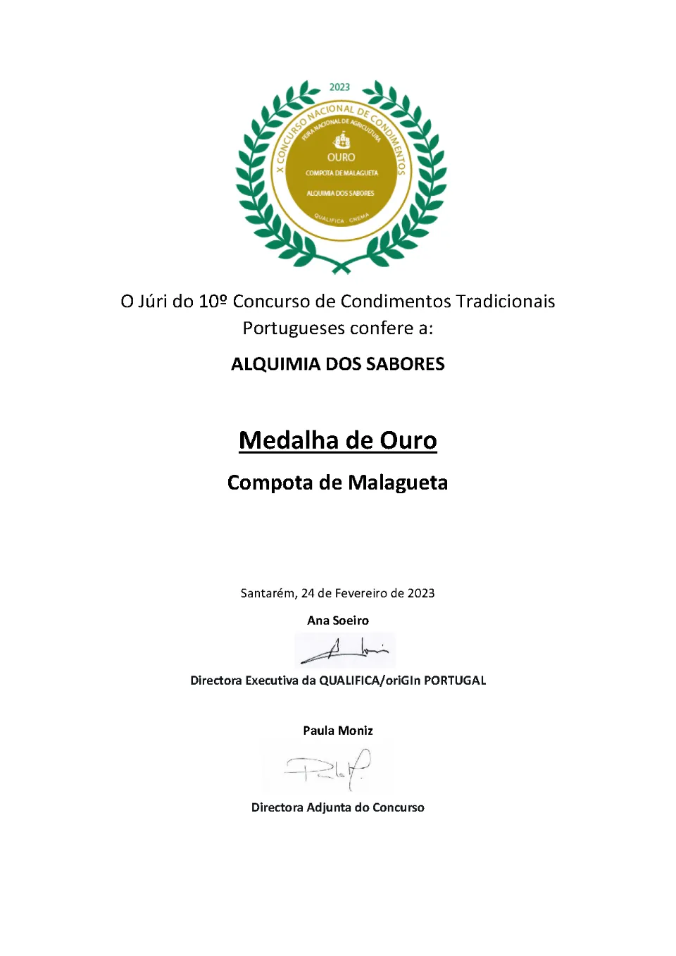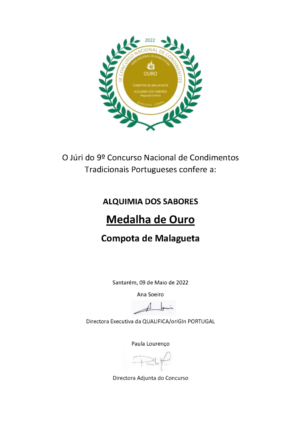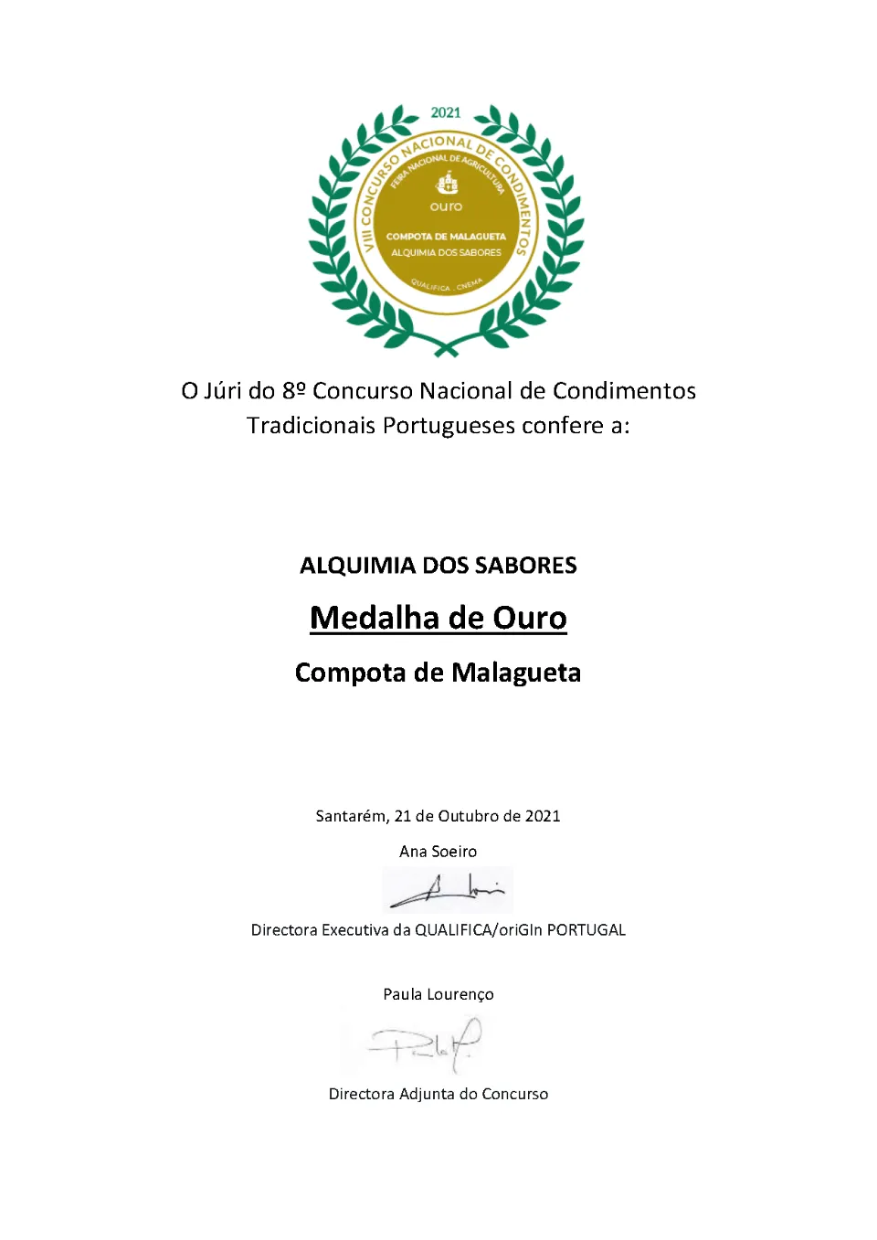 O júri do 9.º Concurso Nacional de Condimentos Tradicionais Portugueses conferiu à Alquimia dos Sabores a Medalha de Ouro pela sua Compota de Malagueta.