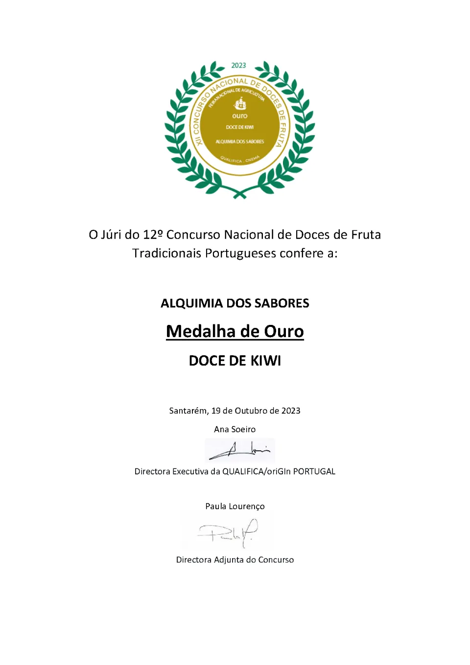 O júri do 12.º Concurso Nacional de Doces de Fruta Tradicionais Portugueses conferiu à Alquimia dos Sabores a Medalha de Ouro pelo Doce Kiwi.