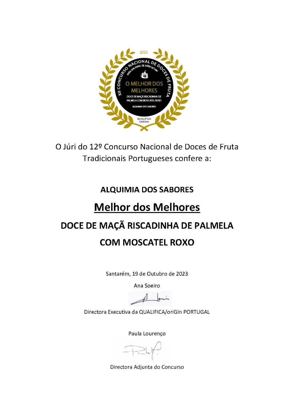 O júri do 12.º Concurso Nacional de Doces de Fruta Tradicionais Portugueses conferiu à Alquimia dos Sabores o título de o Melhor dos Melhores pelo Doce de Maçã Riscadinha de Palmela com Moscatel Roxo.