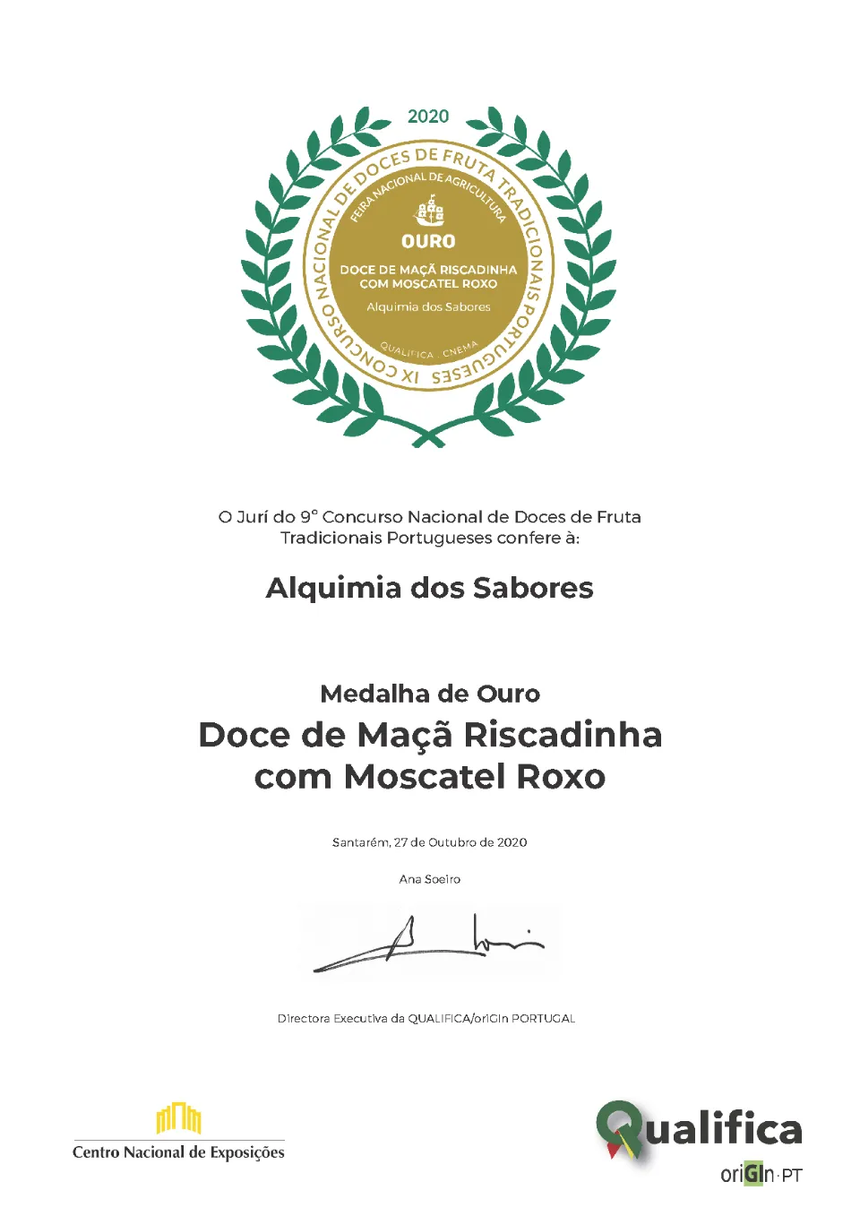 O júri do 9.º Concurso Nacional de Doces de Fruta Tradicionais Portugueses conferiu à Alquimia dos Sabores a Medalha de Ouro pelo Doce de Maçã Riscadinha com Moscatel Roxo.