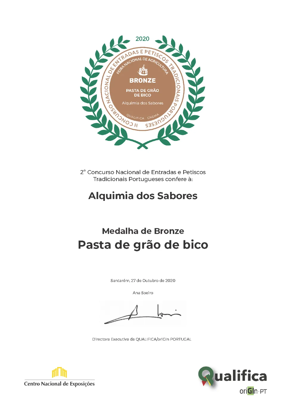 O júri do 2.º Concurso Nacional de Doces de Fruta Tradicionais Portugueses conferiu à Alquimia dos Sabores a Medalha de Bronze pela Pasta de Grão de Bico.