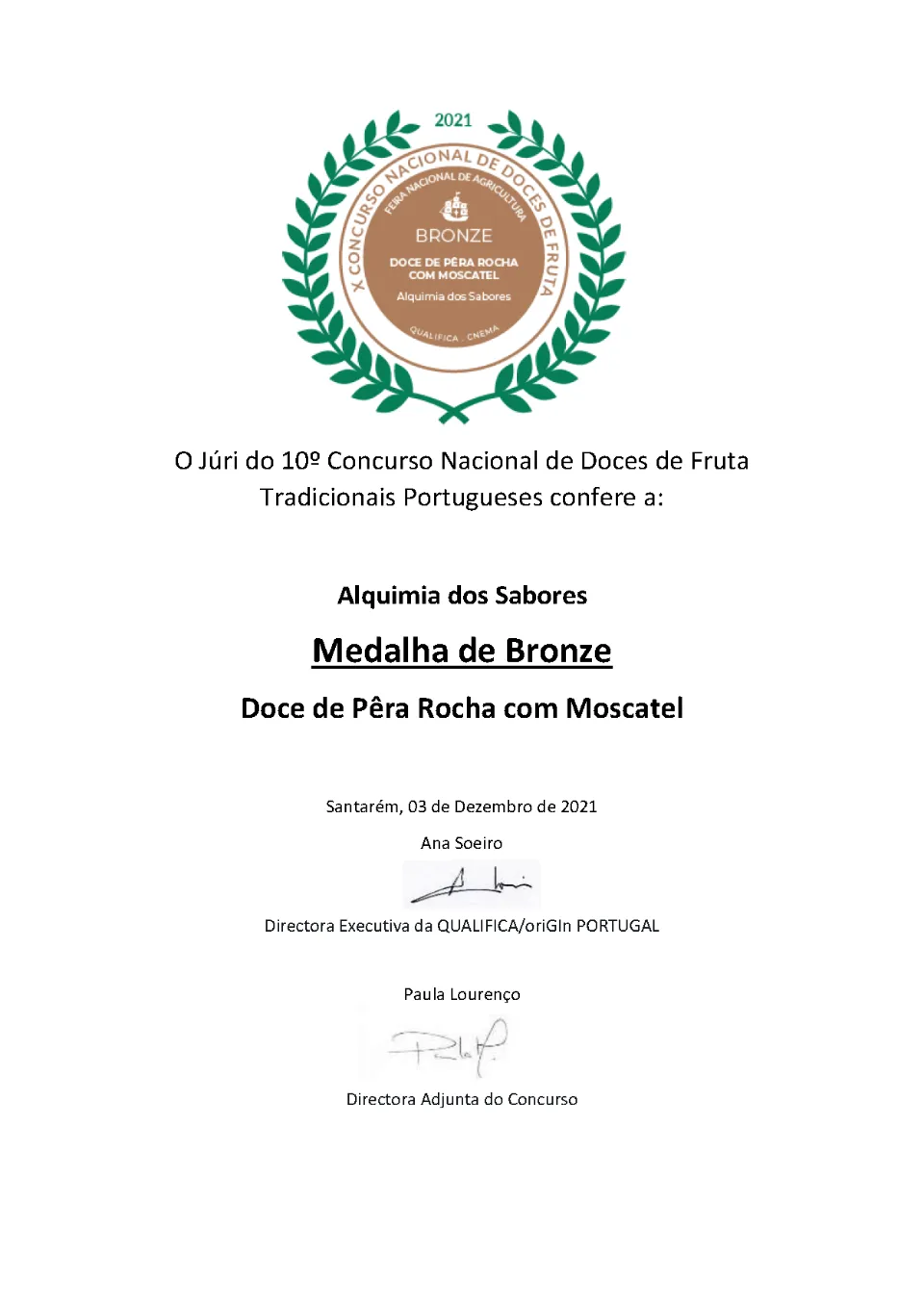 O júri do 10.º Concurso Nacional de Doces de Fruta Tradicionais Portugueses conferiu à Alquimia dos Sabores a Medalha de Bronze pelo seu Doce de Pêra Rocha e Moscatel.