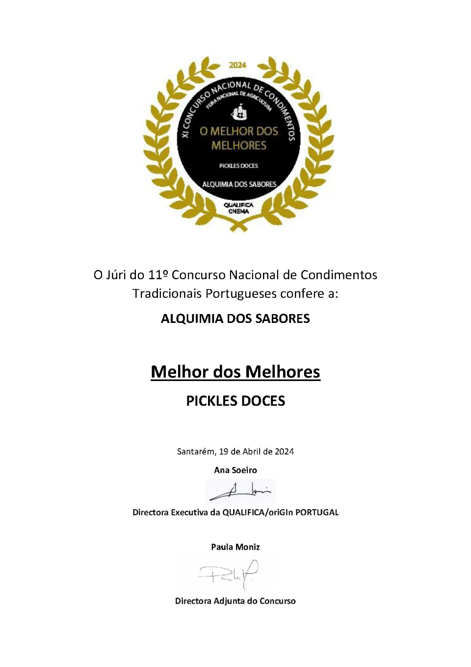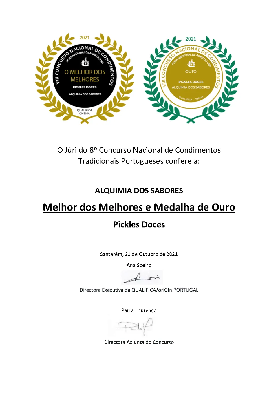 O júri do 9.º Concurso Nacional de Condimentos Tradicionais Portugueses conferiu à Alquimia dos Sabores a Medalha de Ouro e o Melhor dos Melhores, pelos seus Pickles Doces.
