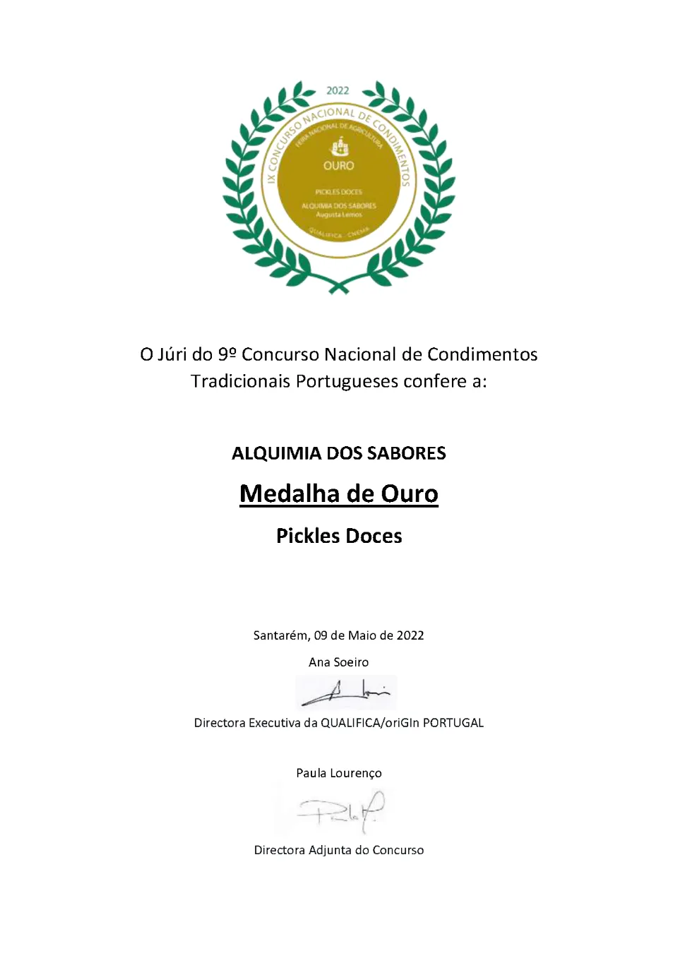 O produto Pickles Doces da Alquimia dos Sabores alcançou a Medalha de Ouro no Concurso Nacional de Sal e Condimentos Tradicionais Portugueses de 2019. Ver Certificado