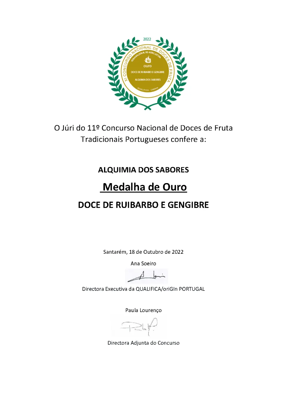 O júri do 11.º Concurso Nacional de Doces de Fruta Tradicionais Portugueses conferiu à Alquimia dos Sabores a Medalha de Ouro pelo Doce de Ruibarbo e Gengibre.